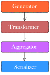 | A generator produces an XML document. The most common generator is the file generator that simply reads an XML file. A generator is the equivalent of a Cocoon 1 producer. A transformer transforms an XML document. The most common transformer is the XSLT transformer. A transformer is the equivalent of a Cocoon 1 processor. An aggregator merges XML documents. A serializer render an XML document for instance in HTML or in PDF. A serializer is the equivalent of a Cocoon 1 formatter. |