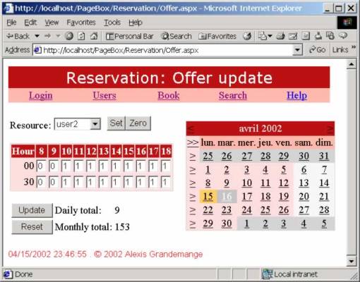 When you select total, the schedule is disabled and shows the total number of resources in every slot (defined using Offer.aspx). When you select booked, the schedule is disabled and shows the number of resources booked in every slot (booked using Book.aspx). When you select available, the schedule is disabled and shows the number of resources available in every slot (slot_total - slot_booked). CalendarThe calendar allows selecting a day, a week (using the > link) or a month (using the >> link). Selecting a week or a month allows defining the same schedule for a week or a month. When you select a date the schedule is populated from the content of the resource table for that date. When you select a week or month the schedule is populated from the content of the resource table for the first date of the range. ScheduleWhen you selected an employee account on the Resource dropdown list, you can set all slots to one using the Set button or set all slot to zero with the zero button. You can also enter 0 or 1 in every slot. If a slot is set to 1 it means that the employee will be able to take care of a customer during this slot. Click on Update to commit the schedule changes and on Reset to cancel the changes. If you remove offer below the number of bookings, then the change is roll backed and you get a message “Invalid change: not enough resources at hour on month/day/year”.